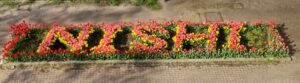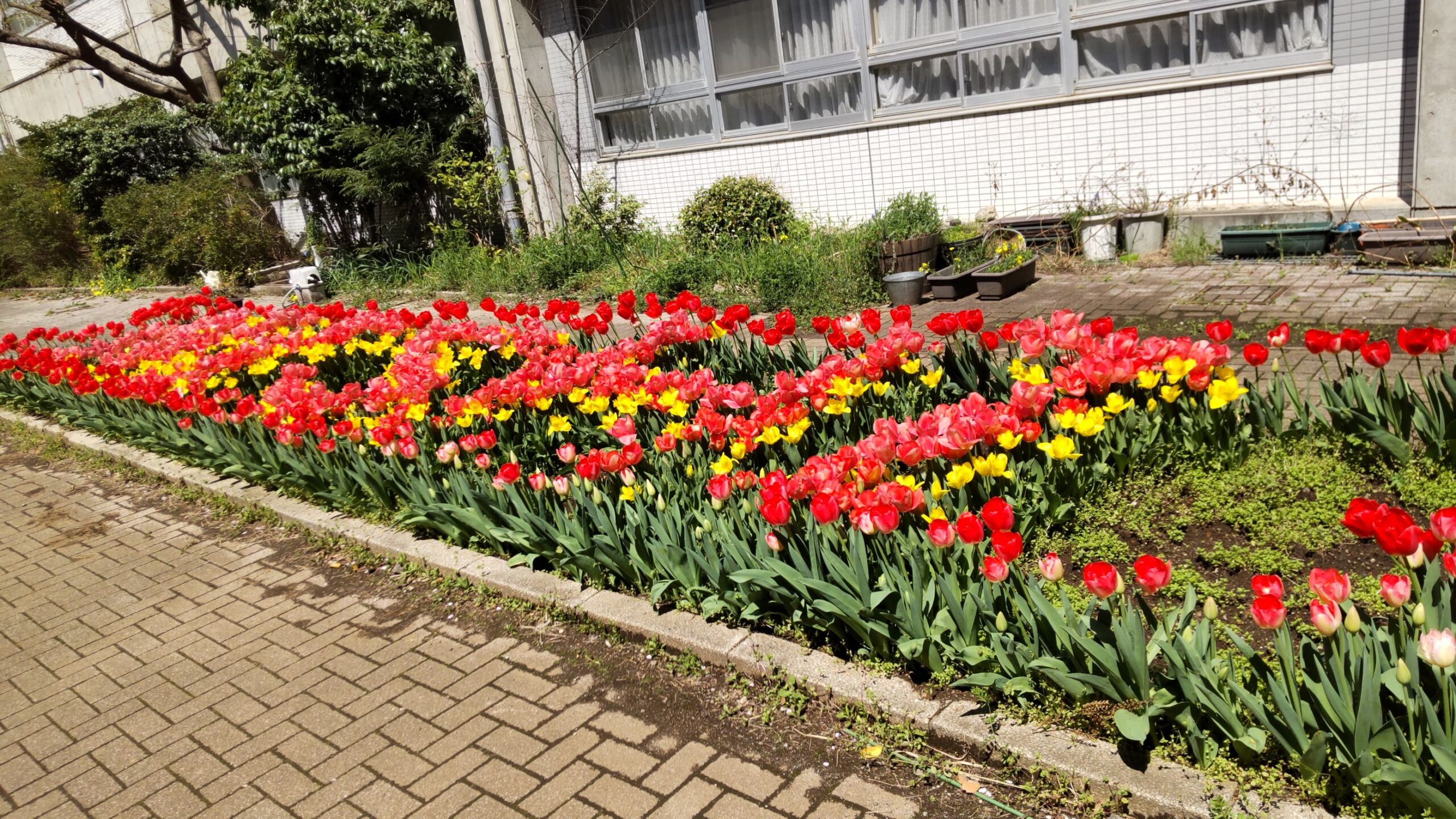 今年も中庭の花壇の「NISHI」を象ったチューリップが新入生を迎えました。2026年4月3日撮影